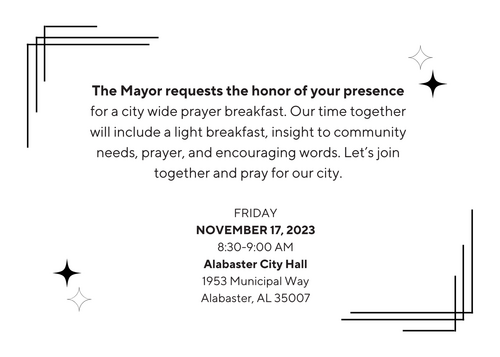 Join us for our annual Prayer Breakfast at Alabaster City Hall on Friday, November 17th. The chamber will be open at 8:00 AM for a light breakfast and time to connect and we will begin our time of prayer at 8:30 AM and end by 9:00 AM. Mayor Brakefield will join us and speak a word of encouragement, we will have Chick-fil-A for breakfast, and a time of prayer.